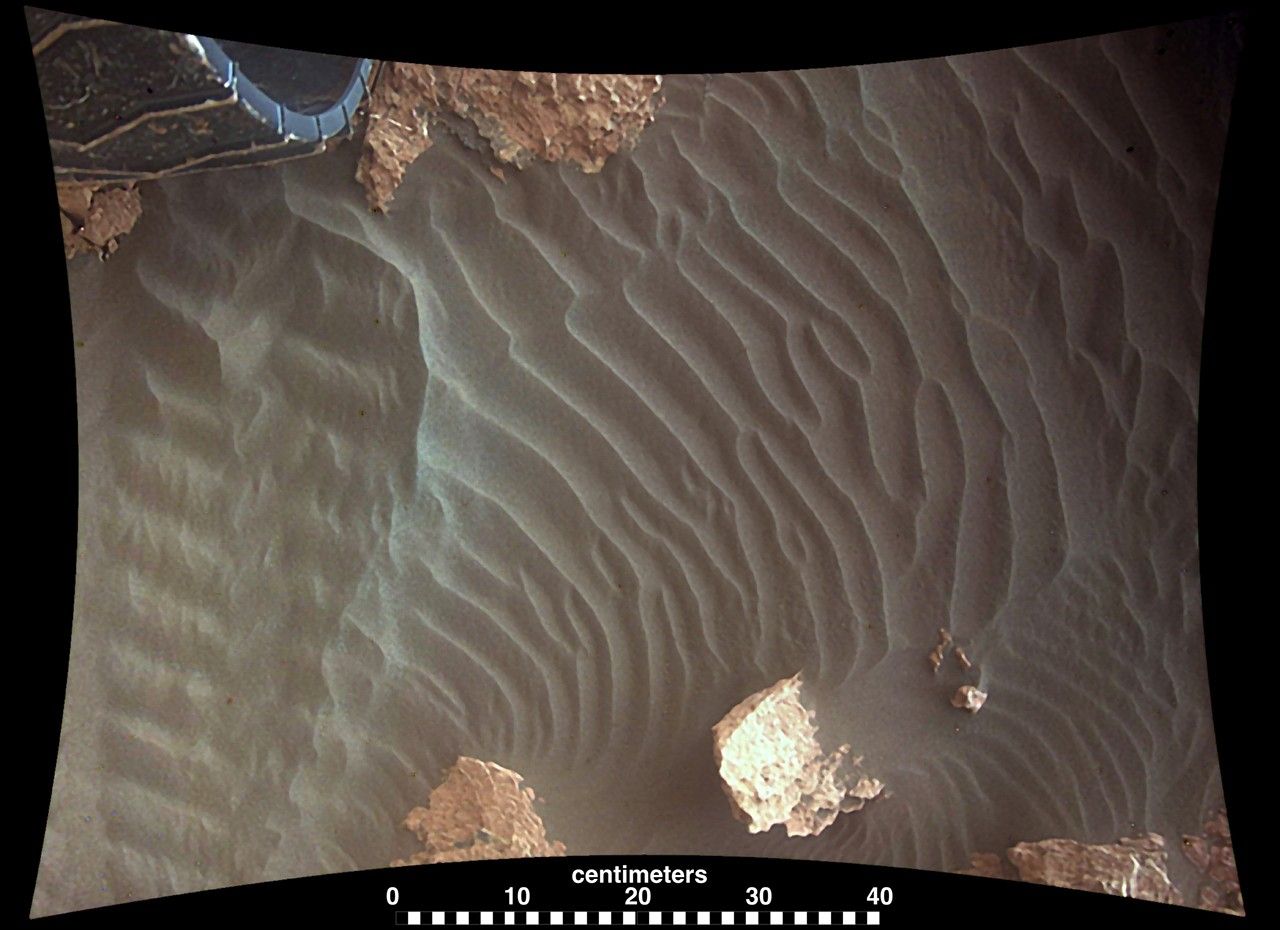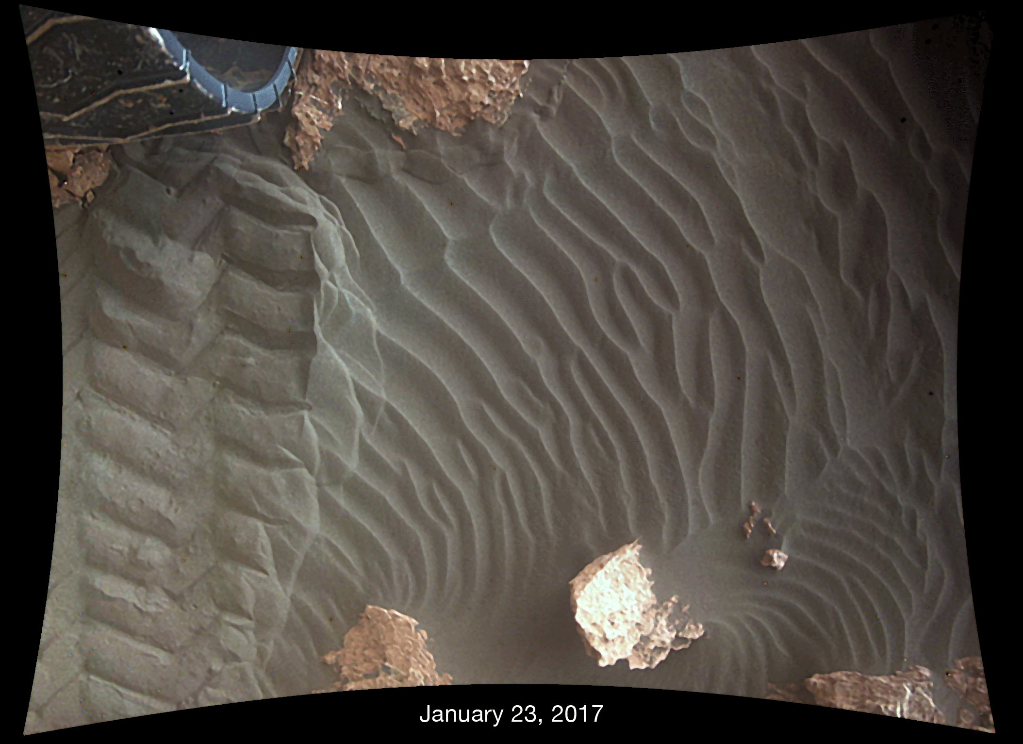 The first image was taken on Jan. 23, 2017, during the 1,587th Martian day, or sol, of Curiosity's work on Mars. Figure 1 above is the image with a scale bar in centimeters. The second was taken on Jan. 24, 2017 (Sol 1588). The day-apart images by MARDI were taken as a part of investigation of wind's effects during Martian summer, the windiest time of year in Gale Crater.