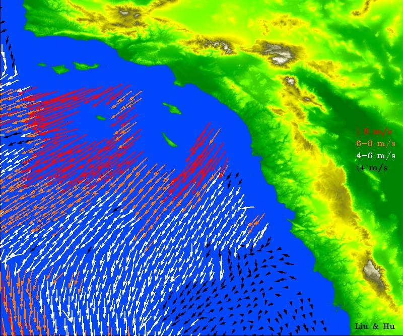 The wind speeds and directions are retrieved from range-compressed backscatter data measured by QuikScat that has much higher spatial resolution than QuikScat's standard data products. Useful applications of high-resolution science-quality wind products derived from range-compressed backscatter have been demonstrated in two scientific papers: one on Hurricane Floyd and the other on Catalina Eddies. This is the first demonstration on near-real-time retrieval applications.