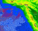 High-resolution ocean surface wind data from NASA's Quick Scatterometer (QuikScat) illustrate the strength of Santa Ana winds that pounded Southern California this week, causing damage and spreading brush fires. The colored arrows represent various ranges of wind speed, which were still well in excess of 30 knots (34 miles per hour), even after reaching the ocean and weakening. Santa Ana winds are offshore and down-slope winds unique to Southern California that are usually channeled through mountain gaps. These Santa Ana winds extend more than 500 kilometers (310 miles) offshore before changing direction to flow along the shore.