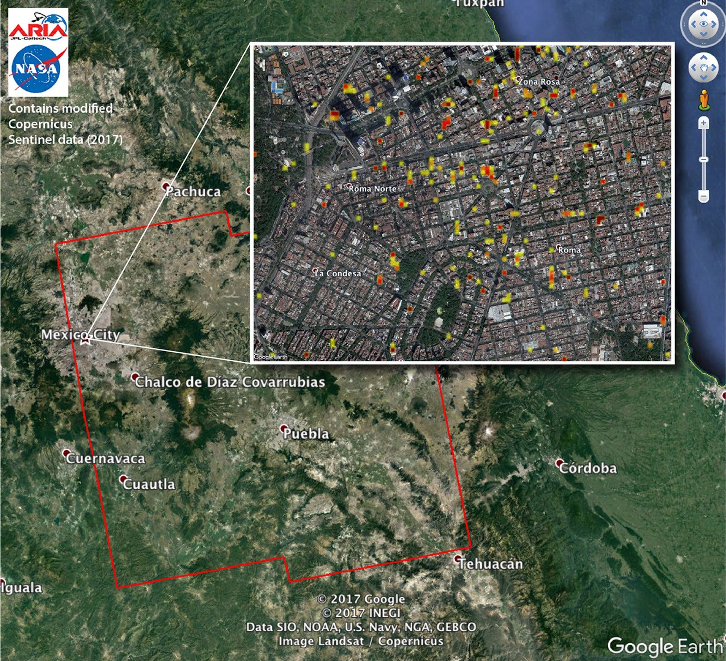 The map covers an area of 109 by 106 miles (175 by 170 kilometers). Each pixel measures about 33 yards (30 meters) across. The color variation from yellow to red indicates increasingly more significant ground and building surface change. Preliminary validation was done by comparing the DPM to a crowd-sourced Google Map (https://www.google.com/maps/d/u/0/viewer?mid=1_-V97lbdgLFHpx-CtqhLWlJAnYY≪=19.41452166501326%2C-99.16498240436704&z=16). This damage proxy map should be used as guidance to identify damaged areas, and may be less reliable over vegetated areas. Sentinel-1 data were accessed through the Copernicus Open Access Hub. The image contains modified Copernicus Sentinel data (2017), processed by ESA and analyzed by the NASA/JPL-Caltech ARIA team. This research was carried out at JPL under contract with NASA.