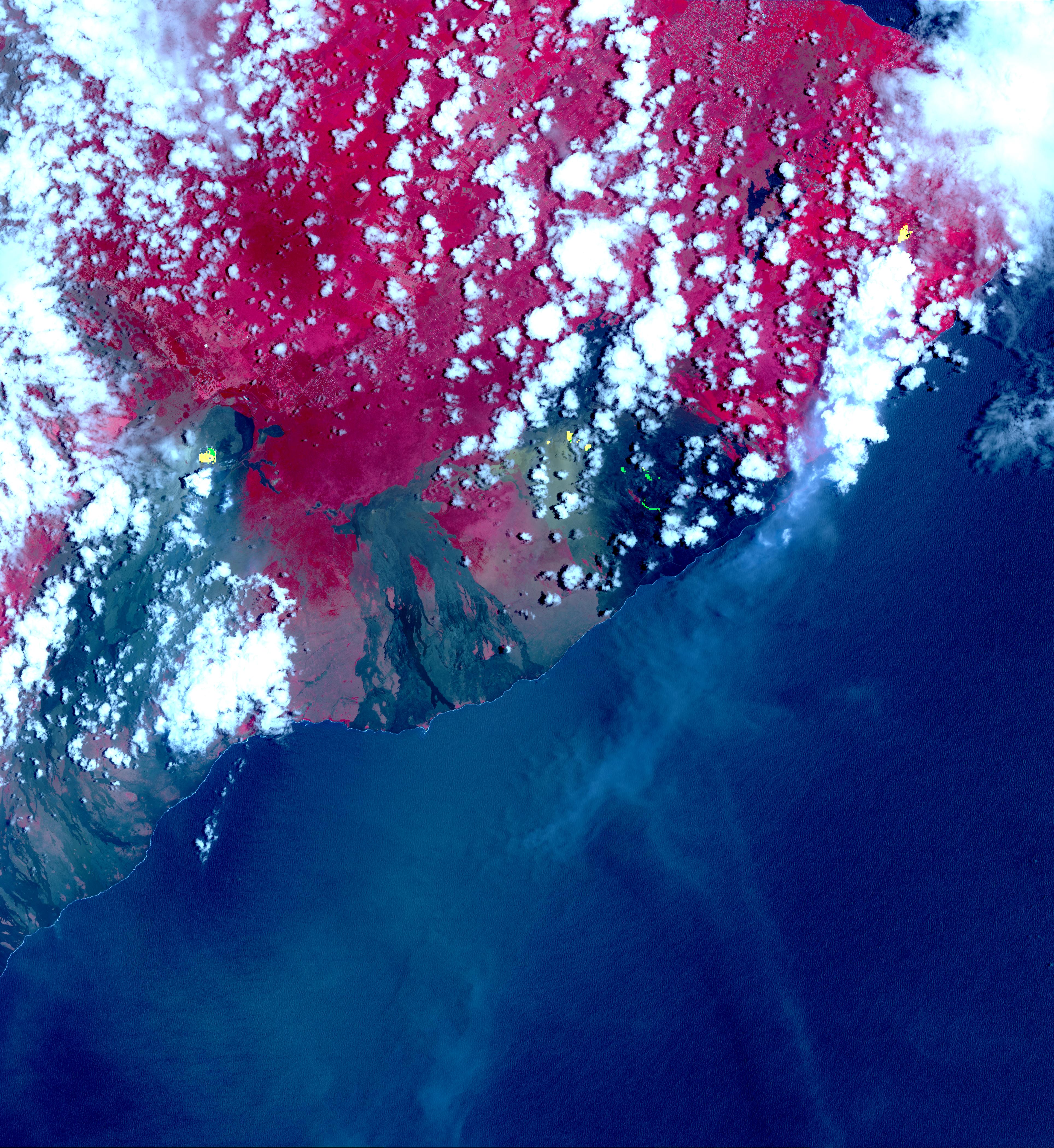The middle spots are Pu'u O'o crater, and lava flows descending the slopes to the southeast. The westernmost area is the crater and lava lake on Kilauea's summit. The greenish area southwest of Pu'u O'o is ash deposits from its short eruption on Friday.