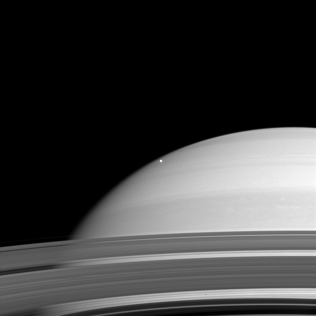 Overexposed Mimas stands starkly against the disk of Saturn as the dim shadow of Epimetheus is captured through the C ring in the planet's rings (right of center at the bottom of the image). In reality, Mimas orbits in the same plane as the rings; it is Cassini's viewing geometry that tricks our eyes.