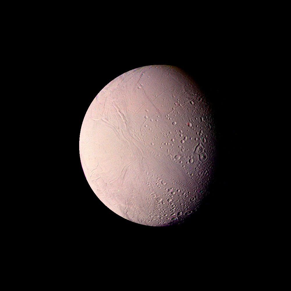 This Voyager 2 mosaic of Enceladus was made from images taken through the clear, violet and green filters Aug. 25, 1981, from a distance of 119,000 kilometers (74,000 miles). In many ways, the surface of this satellite of Saturn resembles that of Jupiter's Galilean satellite Ganymede. Enceladus, however, is only one-tenth Ganymede's size. Some regions of Enceladus show impact craters up to 35 kilometers (22 miles) in diameter, whereas other areas are smooth and uncratered. Linear sets of grooves tens of kilometers long traverse the surface and are probably faults resulting from deformation of the crust. The uncratered regions are geologically young and suggest that Enceladus has experienced a period of relatively recent internal melting. The rims of several craters near the lower center of the picture have been flooded by the smooth terrain. The satellite is about 500 kilometers (310 miles) in diameter and has the brightest and whitest surface of any of Saturn's satellites. Features as small as 2 kilometers (1.2 miles) are visible in this highest-resolution view of Enceladus. The Voyager project is managed for NASA by the Jet Propulsion Laboratory, Pasadena, Calif.