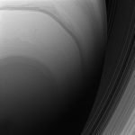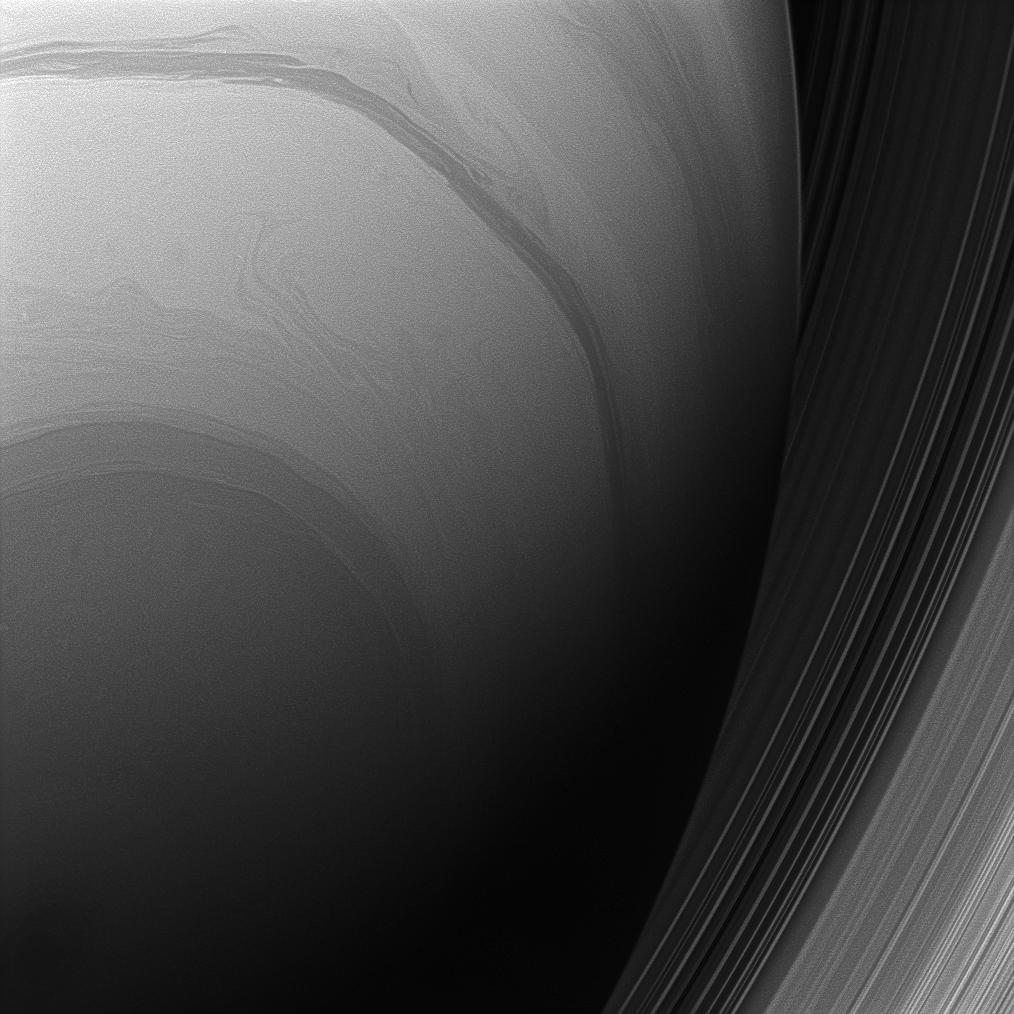 The Cassini spacecraft looks upward at the swirling clouds of Saturn's southern hemisphere. The C and B rings are seen at right, beyond the planet's nightside limb.
