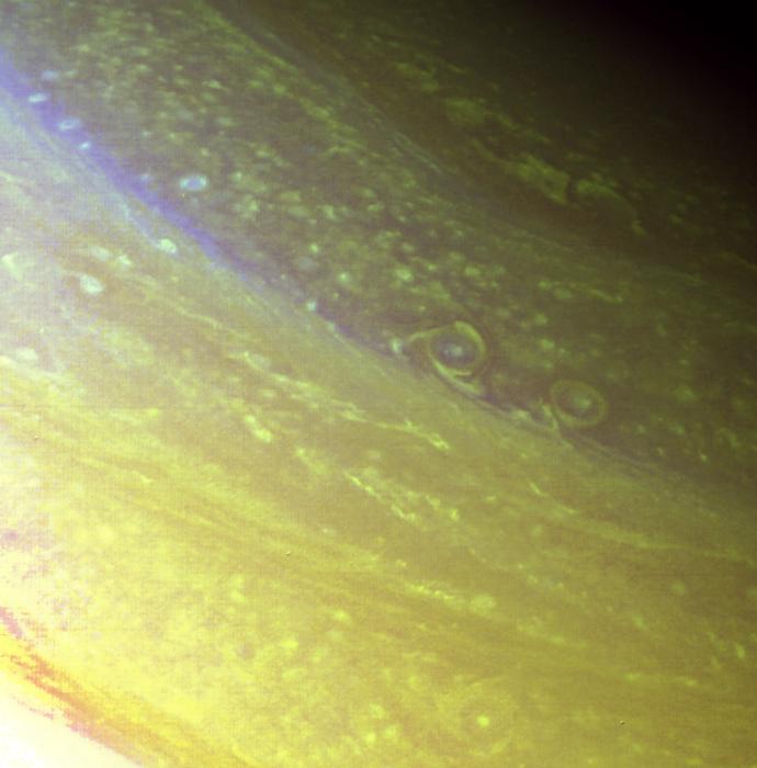 The north polar region of Saturn is pictured in great detail in this Voyager 2 image obtained Aug. 25 from a range of 633,000 kilometers (393,000 miles). Two oval cloud systems some 250 km. (150 mi.) across are visible at about 72 degrees north latitude. The bright spot in the center of the leftmost cloud is a convective cloud storm about 60 km. (37 mi.) across. The outer ring of material rotates in an anti-cyclonic sense (counterclockwise in the northern hemisphere). A similar cloud structure of comparable dimension appears at 55 degrees north (bottom center of this picture). These northern latitudes contain many bright, small-scale cloud spots--only a few tens of kilometers across--representative of convective cloud systems. Across the top of this image stretch several long, linear, wavelike features that may mark the northernmost east-flowing jet in Saturn's atmosphere. In this orange-and-violet-image composite, the smallest features visible are about 16 km. (10 mi.) across. The Voyager project is managed for NASA by the Jet Propulsion Laboratory, Pasadena, Calif.