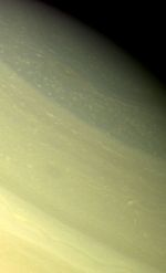 A vortex, or large atmospheric storm, is visible at 74` north latitude in this color composite of Voyager 2 Saturn images obtained Aug. 25, 1979 from a range of 1 million kilometers (620,000 miles). Three wide-angle-camera images taken through green, orange and blue filters were used. This particular storm system seems to be one of the few large-scale structures in Saturn's polar region, which otherwise is dominated by much smaller-scale features suggesting convection. The darker, bluish structure (upper right) oriented east to west strongly suggests the presence of a jet stream at these high latitudes. The appearance of a strong east-west flow in the polar-region could have a major influence on models of Saturn's atmospheric circulation, if the existence of such a flow can be substantiated in time sequences of Voyager images. The smallest features visible in this photograph are about 20 km. (12 mi.) across. The Voyager project is managed for NASA by the Jet Propulsion Laboratory, Pasadena, Calif.