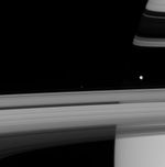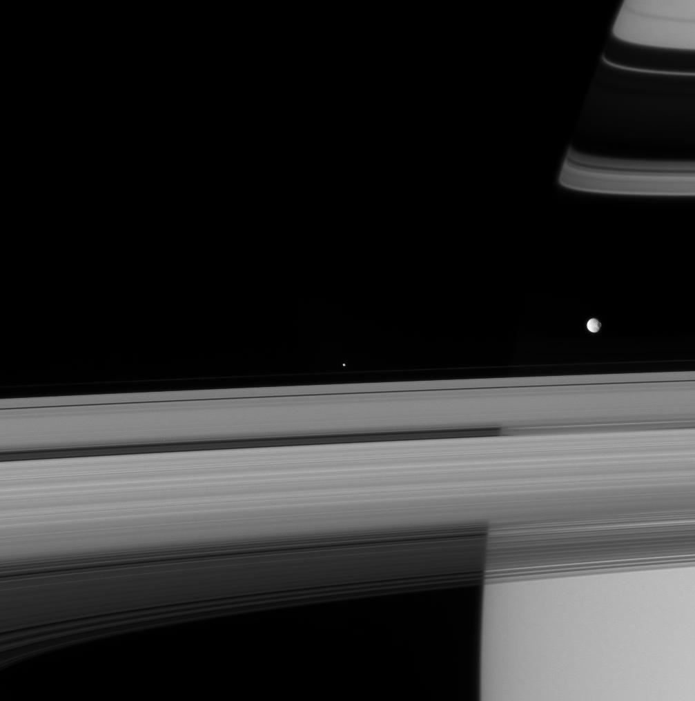 Mimas (397 kilometers, or 247 miles across), with its prominent crater Herschel, is seen at right. The shepherd moon Pandora (84 kilometers, or 52 miles across) cruises along at center, just beyond Saturn's F ring. Orbiting nearly 44,000 kilometers (27,500 miles) closer to Saturn than its more distant neighbor, the swifter Pandora is about to overtake Mimas.