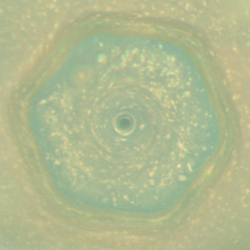 In both views, Saturn's polar hexagon dominates the scene. The comparison shows how clearly the color of the region changed in the interval between the two views, which represents the latter half of Saturn's northern hemisphere spring.