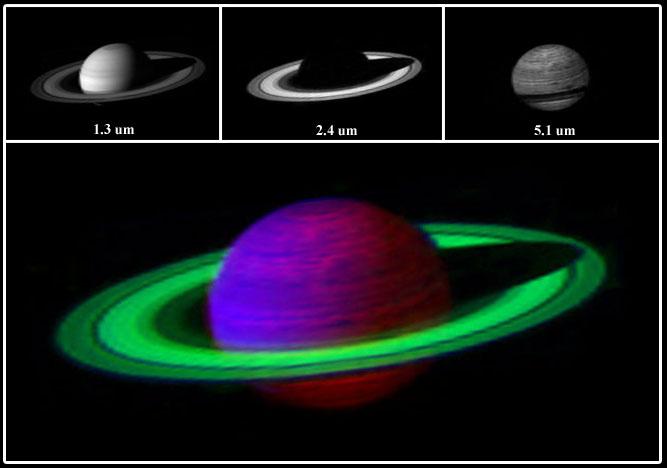 The image at the upper left was taken at 1.3 microns, where both Saturn and its rings strongly reflect light. The center image in the top panel was taken at 2.4 microns, where the rings strongly reflect light, but Saturn, because of the methane in its atmosphere, absorbs most of the light. The third image on the right in the panel was taken at a wavelength of 5 microns where, because they are composed of almost pure water ice, the rings absorb almost all the light, and Saturn, because its interior is warm, glows. Assigning each of the three images to blue, green and red, respectively, results in the beautiful, false-color, composite image shown below.