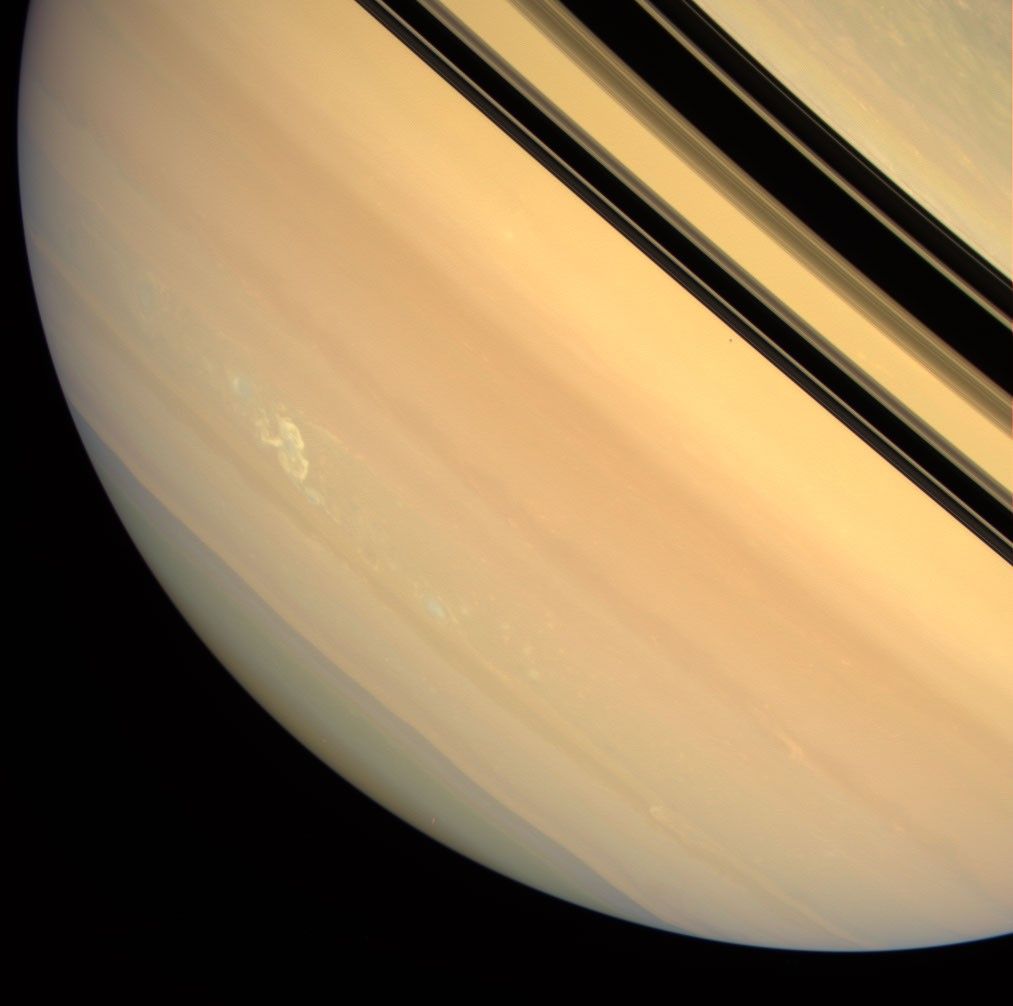 The view at left was created by combining images taken using red, green and blue spectral filters, and shows Saturn in colors that approximate what the human eye would see. The storm stands out with greater clarity in the sharpened, enhanced color view at right. This view combines images taken in infrared, green and violet light at 939, 567 and 420 nanometers respectively and represents an expansion of the wavelength region of the electromagnetic spectrum visible to human eyes. This view looks toward the un-illuminated side of the rings from about 3 degrees above the ringplane. Janus (181 kilometers, or 113 miles across) appears as a dark speck just beneath the rings in both images.