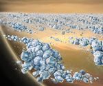 This is an artist concept of a close-up view of Saturn's ring particles. The planet Saturn is seen in the background (yellow and brown). The particles (blue) are composed mostly of ice, but are not uniform. They clump together to form elongated, curved aggregates, continually forming and dispersing. The space between the clumps is mostly empty. The largest individual particles shown are a few meters (yards) across. Image by Marty Peterson, based on a 1984 image by William K. Hartmann. Hartmann's image illustrated early research by Stuart Weidenschilling and co-workers at the Planetary Science Insitute, on dynamical ephemeral bodies in Saturn's rings.
