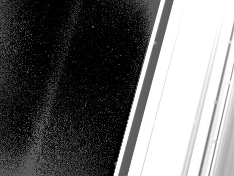 This long exposure of the ring region about 150,000 to 200,000 kilometers (90,000 to 120,000 miles) from the center of Saturn captured the very faint G-ring, seen at left. The ring was discovered by Voyager 1 last fall at a similar phase angle. Voyager 2 was about 305,000 km. (189,000 mi.) away when it took this image Aug. 26. The small rectangular dots forming a regular pattern are reseau (reference) marks on the Voyager vidicon camera. The high-resolution detail in the A-ring has been washed out by the very long exposure needed to bring out the very tenuous G-ring. The Voyager project is managed for NASA by the Jet Propulsion Laboratory, Pasadena, Calif.