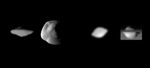 From left to right: a view of Atlas' trailing hemisphere, with north up, at a spatial scale of about 1 kilometer (0.6 mile) per pixel; Atlas seen at about 250 meters (820 feet) per pixel from mid-southern latitudes, with the sub-Saturn hemisphere at the top and leading hemisphere to the left; Pan's trailing hemisphere seen at about 3 kilometers (2 miles) per pixel from low southern latitudes; an equatorial view, with Saturn in the background, of Pan's anti-Saturn hemisphere at about 1 kilometer (0.6 mile) per pixel.