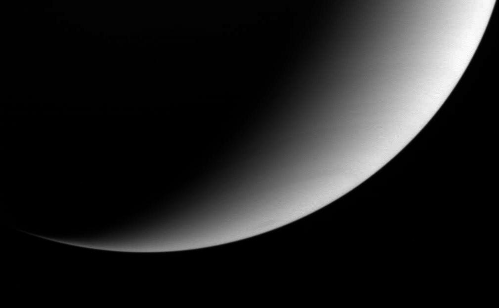 The image was taken in visible light with the Cassini spacecraft wide angle camera on Oct. 30, 2004, at a distance of approximately 1.4 million kilometers (870,000 miles) from Saturn and at a Sun-Saturn-spacecraft, or phase, angle of 123 degrees. North is rotated about 20 degrees to the left. The image scale is 82 kilometers (51 miles) per pixel.