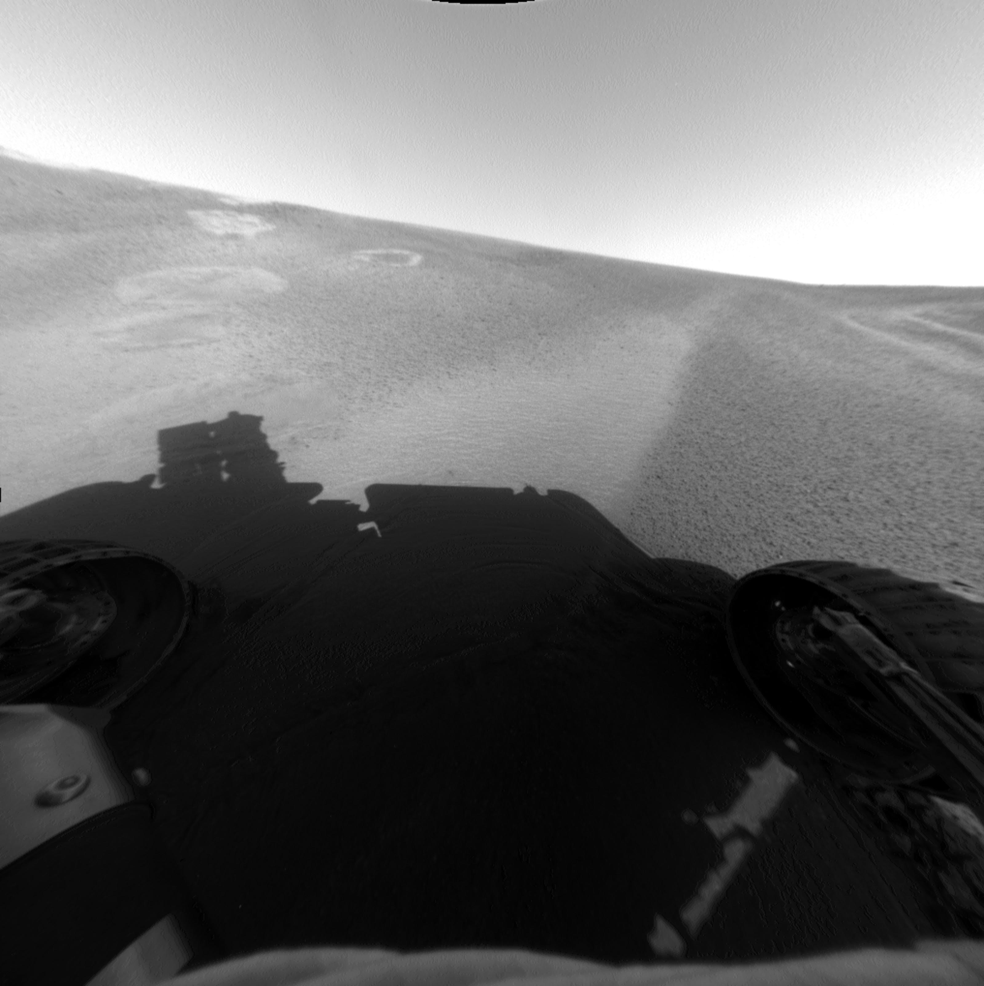 This image from the Mars Exploration Rover Opportunity's front hazard-avoidance camera shows the rover at its Sol 53 (March 17, 2004) location within the "Eagle Crater" landing site. Dubbed "Neopolitan," this location has three different soil patches: a very light unit, a dark unit, and an airbag bounce mark. Scientists are imaging each of these units as part of a crater soil survey. They hope to better understand the origin of the soils they see in the crater and the relationship of the soils to the rocks in Opportunity ledge. This image was taken on sol 52 of Opportunity's journey (March 16, 2004).