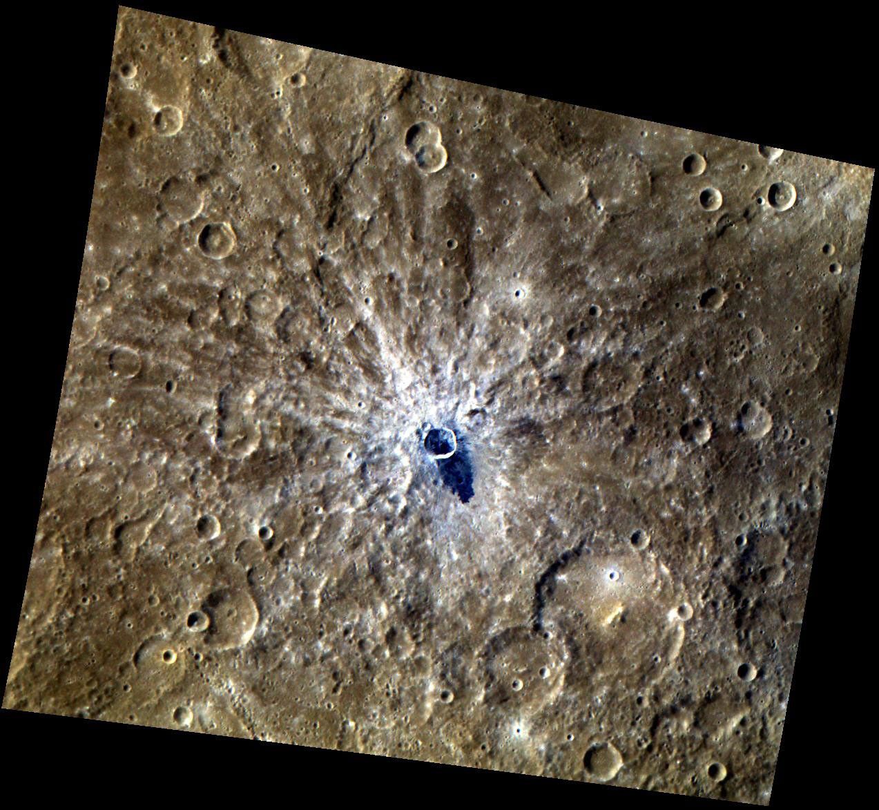 This high-resolution color image shows a 14-kilometer diameter crater that is relatively young, as indicated by the bright rays that cross the neighboring features. A dark "tongue" of impact melt, which has a bluer color than the nearby surface, appears to have flowed out of the crater.