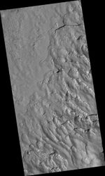 A polygonal pattern of fractures, commonly associated with "scalloped terrain," can be found on the surface surrounding and within the depressions. The fractures indicate that the surface has undergone stress that may have been caused by subsidence, desiccation, or thermal contraction.
