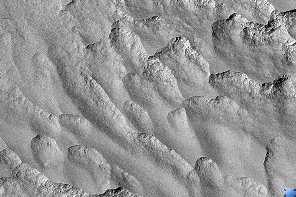 Steep scarps consistently face the south pole while more gentle slopes face in the direction of the equator. This is most likely due to differences in solar heating.