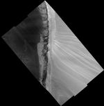 This HiRISE image is of the north polar layered deposits (PLD) and underlying units exposed along the margins of Chasma Boreale. Chasma Boreale is the largest trough in the north PLD, thought to have formed due to outflow of water from underneath the polar cap, or due to winds blowing off the polar cap, or a combination of both. At the top and left of the image, the bright area with uniform striping is the gently sloping surface of the PLD. In the middle of the image this surface drops off in a steeper scarp, or cliff. At the top of this cliff we see the bright PLD in a side view, or cross-section. From these two perspectives of the PLD it is evident that the PLD are a stack of roughly horizontal layers. The gently sloping top surface cuts through the vertical sequence of layers at a low angle, apparently stretching the layers out horizontally and thus revealing details of the brightness and texture of individual layers. The surface of the PLD on the scarp is also criss-crossed by fine scale fractures. The layers of the PLD are probably composed of differing proportions of ice and dust, believed to be related to the climate conditions at the time they were deposited. In this way, sequences of polar layers are records of past climates on Mars, as ice cores from terrestrial ice sheets hold evidence of past climates on Earth. Further down the scarp in the center of the image the bright layers give way suddenly to a much darker section where a few layers are visible intermittently amongst aprons of dark material. The darkest material, with a smooth surface suggestive of loose grains, is thought to be sandy because similar exposures elsewhere show it to be formed into dunes by the wind. An intermediate-toned material also appears to form aprons draped over layers in the scarp, but its surface contains lobate structures that appear hardened into place and its edges are more abrupt in places, suggesting it may contain some ice or other cementing agent that makes it more competent, or resistant. At the base of the cliff, especially visible on the right side of the image, are several prominent bright layers with regular, rectangular-shaped polygons. Due to similarities in brightness and surface fracturing with the upper PLD, these bottom layers are also likely to be ice rich. The presence of sandy material sandwiched in between the upper PLD and these bottom layers suggests that the climate was once much different from the times during which the icier layers were deposited. The scattered bright and dark points are boulder-sized blocks that are likely pieces of the fractured PLD or other darker layers that have broken off and fallen downhill. At the bottom and right of the image, the floor of Chasma Boreale is dark, with a knobby texture and irregular polygons. Several circular features surrounded by an area that is slightly smoother, lighter, and raised relative to the chasm floor may be impact craters that have been modified after their formation in ice-rich ground.