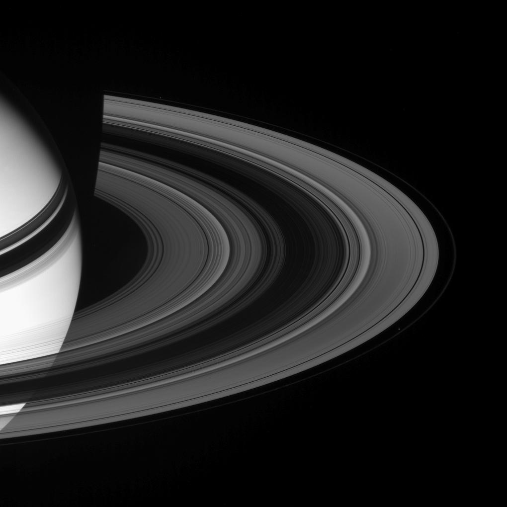 Sunlight scatters through Saturn's rings, emerging on the unilluminated side. Prometheus (102 kilometers, or 63 miles across, lower right) and Pandora (84 kilometers, or 52 miles across, upper left) are visible here, respectively internal and external to the narrow F ring.