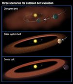 This illustration shows three possible scenarios for the evolution of asteroid belts. In the top panel, a Jupiter-size planet migrates through the asteroid belt, scattering material and inhibiting the formation of life on planets. The second scenario shows our solar-system model: a Jupiter-size planet that moves slightly inward but is just outside the asteroid belt. In the third illustration, a large planet does not migrate at all, creating a massive asteroid belt. Material from the hefty asteroid belt would bombard planets, possibly preventing life from evolving.