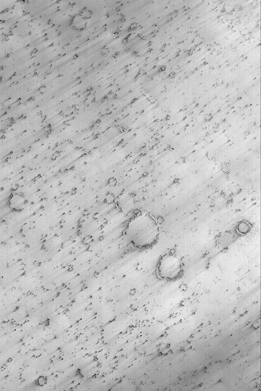 This Mars Global Surveyor (MGS) Mars Orbiter Camera (MOC) image shows craters and dark wind streaks on a plain on the floor of northeastern Schiaparelli Basin. The streaks indicate that dominant winds blow from the northeast (upper right). The image is located near 1.5°S, 339.8°W. Sunlight illuminates the scene from the lower left; the image covers an area 3 km (1.9 mi) wide.