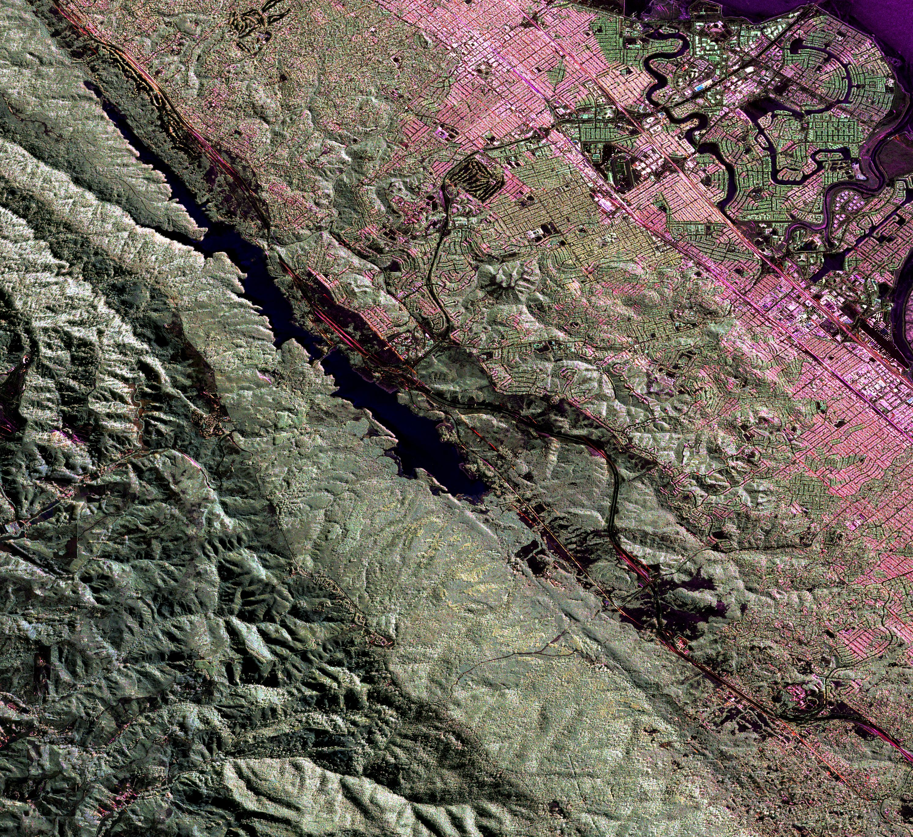 This image is a false-color composite of three channels of the UAVSAR polarimetric data acquired over the San Andreas Fault west of San Mateo, California. The fault runs from the top left to bottom right corner, partly beneath the Crystal Springs Reservoir shown in black. The black line curving along the east side of the fault is the freeway I-280, and California highway 91 runs from the top right across to the center left of the image, heading towards Half Moon Bay to the west. San Mateo and Burlingame are parts of the large urbanized area in various tones of pink and green, and Foster City is the area of curved streets extending out into the San Francisco Bay at the top right. This image will be combined with another image acquired at a later time to measure the motion of the Earth's surface between the two images using the technique called interferometry. The interferometric measurements will allow us to study the pressures building up on the faults at depth. The image is about 15 km (10 miles) across and north is up.