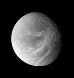 The image was taken in visible light with the Cassini spacecraft wide-angle camera on Sept. 30, 2007. The view was acquired at a distance of approximately 45,000 kilometers (28,000 miles) from Dione and at a Sun-Dione-spacecraft, or phase, angle of 36 degrees. Image scale is 3 kilometers (2 miles) per pixel.