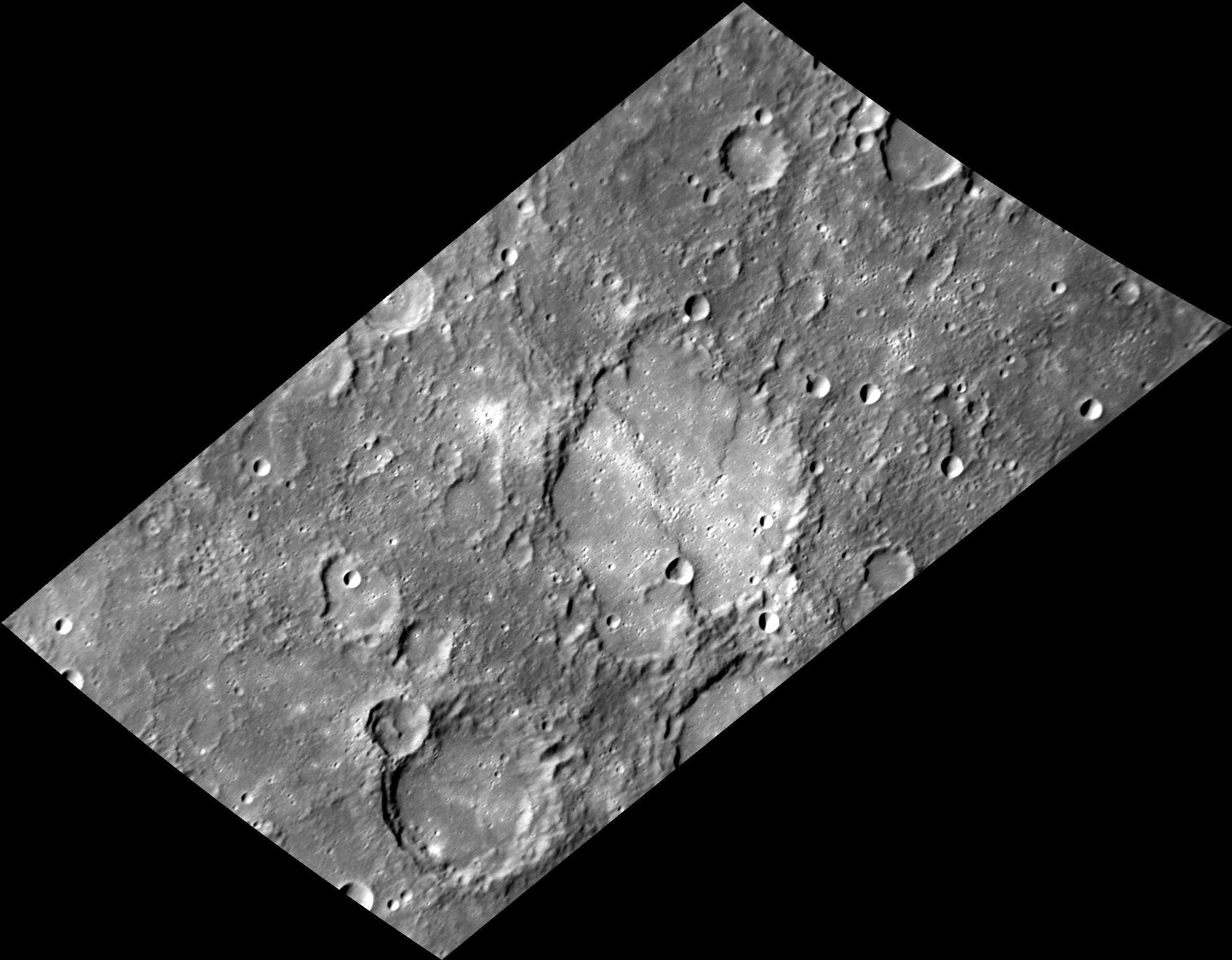 At the center of this view is the 92-km (57-mi.) diameter impact crater Savage. The rim of the crater has been chiseled and degraded by subsequent impacts, and the floor has been filled with volcanic plains. The plains have been modified by compressive forces that produced lobate scarps.