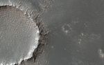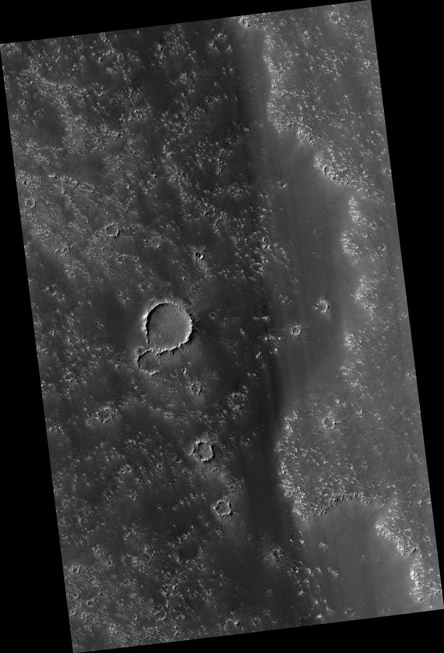 This image is located on the southeastern flank of a volcano on Mars called Arsia Mons. On the eastern side of the image, the lobate margin of an old lava flow is visible among brighter tones.