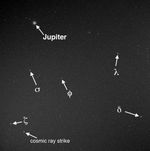 During the vulcanoid search campaign, 4-5 images of the same scene are taken back to back. This procedure allows cosmic ray strikes on the camera's detector to be identified and enables fainter objects to be detected. One such cosmic ray strike is labeled on this image. In this single image, the cosmic ray strike appears similar to the stars, but in the four images taken immediately after this one, the cosmic ray strike is gone whereas the stars remain. Images are also taken hours and days apart, so the motion of objects in the sky can be determined. If a vulcanoid were imaged, its motion through the sky would appear very different from motions of the background stars and known Solar System objects. No vulcanoids have been found yet, but the latest set of acquired images will expand the volume of the search region examined so far.