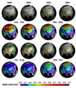 The globes cover most of Asia, eastern Europe and the Middle East, for each of the four seasons in the years 2003 and 2004. Noteworthy differences between the years 2003 and 2004 include increased albedo over the Gobi Desert region during September to November of 2004, compared with this interval in 2003. Surface albedo changes occur naturally on a seasonal and annual basis, but albedo is also sensitive to perturbations such as land use changes. Albedo maps constitute an important dataset in climate studies, particularly climate modeling. Combined with solar exposure estimates, they are also useful in agricultural research (e.g., estimation of crop yields and disease outbreaks) and land management. Global MISR DHR maps are also available for all other parts of the planet, and for monthly as well as seasonal time increments. These and other surface and vegetation products from the MISR instrument are available from the MISR instrument are available from the NASA Langley Atmospheric Sciences Data Center's MISR Level 3 Imagery website.