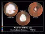 These images, which seem to have been taken while NASA's Hubble Space Telescope (HST) was looking directly down on the Martian North Pole, were actually created by assembling mosaics of three sets of images taken by HST in October, 1996 and in January and March, 1997 and projecting them to appear as they would if seen from above the pole. This first mosaic is a view which could not actually be seen in nature because at this season a portion of the pole would have actually been in shadow; the last view, taken near the summer solstice, would correspond to the Midnight Sun on Earth with the pole fully illuminated all day. The resulting polar maps begin at 50 degrees N latitude and are oriented with 0 degrees longitude at the 12 o'clock position. This series of pictures captures the seasonal retreat of Mars' north polar cap.