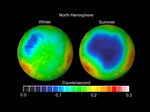 Observations by NASA's 2001 Mars Odyssey spacecraft show a comparison of wintertime (left) and summertime (right) views of the north polar region of Mars in intermediate-energy, or epithermal, neutrons. The maps are based on data from the high-energy neutron detector, an instrument in Odyssey's gamma-ray spectrometer suite. Soil enriched by hydrogen is indicated by the purple and deep blue colors on the maps. Progressively smaller amounts of hydrogen are shown in the colors light blue, green, yellow and red. The hydrogen is believed to be in the form of water ice. In some areas, the abundance of water ice is estimated to be up to 90% by volume. In winter, much of the hydrogen is hidden beneath a layer of carbon dioxide frost (dry ice). In the summer, the hydrogen is revealed because the carbon dioxide frost has dissipated. A shaded-relief rendition of topography is superimposed on these maps for geographic reference.