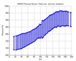 This graph shows about one-fourth of a Martian year's pattern atmospheric pressure at the surface of Mars, as measured by the Rover Environmental Monitoring Station on NASA's Curiosity rover. The rover landed at about the time of the annual minimum in atmospheric pressure and documented a seasonal climb to a pressure peak. The maximum and minimum pressures for each Martian day, or sol, from mid-August 2012 to late February 2013 are plotted. Pressure is designated in pascals. For comparison, 1,000 pascals is about one percent of sea-level atmospheric pressure on Earth.