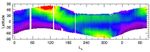 The seasonal trend in the amount of water vapor in Mars' atmosphere, as observed by thermal emission spectrometer on NASA's Mars Global Surveyor orbiter, varies by latitude. This plot starts near the beginning of fall in the southern hemisphere for the year before the Mars Exploration Rover mission began and ends on August 30, 2004, slightly more than one martian year later. Purple represents no water while red represents about 50 precipitable micrometers, which is about 10,000 times less than on Earth. The units of time along the horizontal axis are given in longitude of the Sun (Ls) as measured in a Mars-centered coordinate system, a way to reflect the elliptical nature of Mars' orbit. On this scale, Mars is farthest from the Sun at about 74, which also corresponds to late fall in the southern hemisphere.