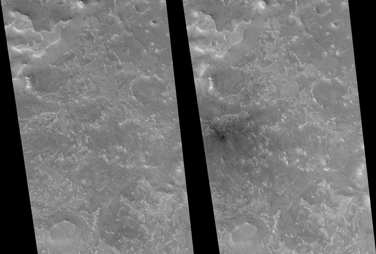 Pictured here is the second of 2 of the 20 new impact craters identified by the Mars Global Surveyor (MGS) Mars Orbiter Camera (MOC) science operations team to have formed between May 1999 and March 2006 that occur at a location that the MOC narrow angle camera imaged previously. This is surprising, given that the narrow angle camera, with its 3 kilometer- (1.9 miles)-wide field of view, has only covered about 5.2% of the martian surface. The other such case is described in an accompanying release, "One of Two Fresh Impact Crater Sites With Before and After Narrow Angle Mars Orbiter Camera Images" (see PIA09023 or MOC2-1614).