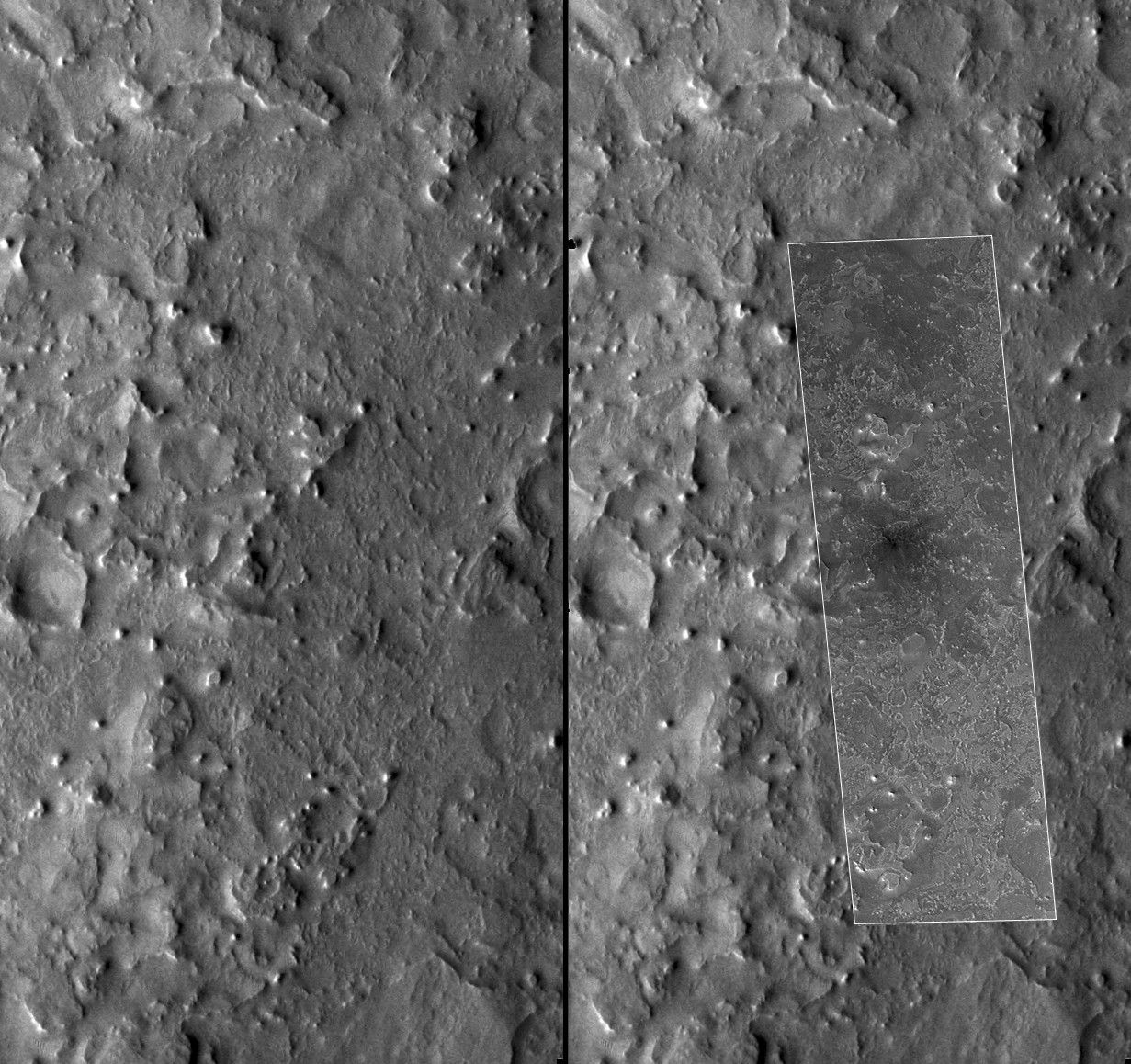 Figure B: This figure shows how the impact site appeared in a previous MOC narrow angle camera image, R13-00039, on 1 January 2004, before the impact occurred. This is compared with MOC image S15-02322, obtained after the impact.