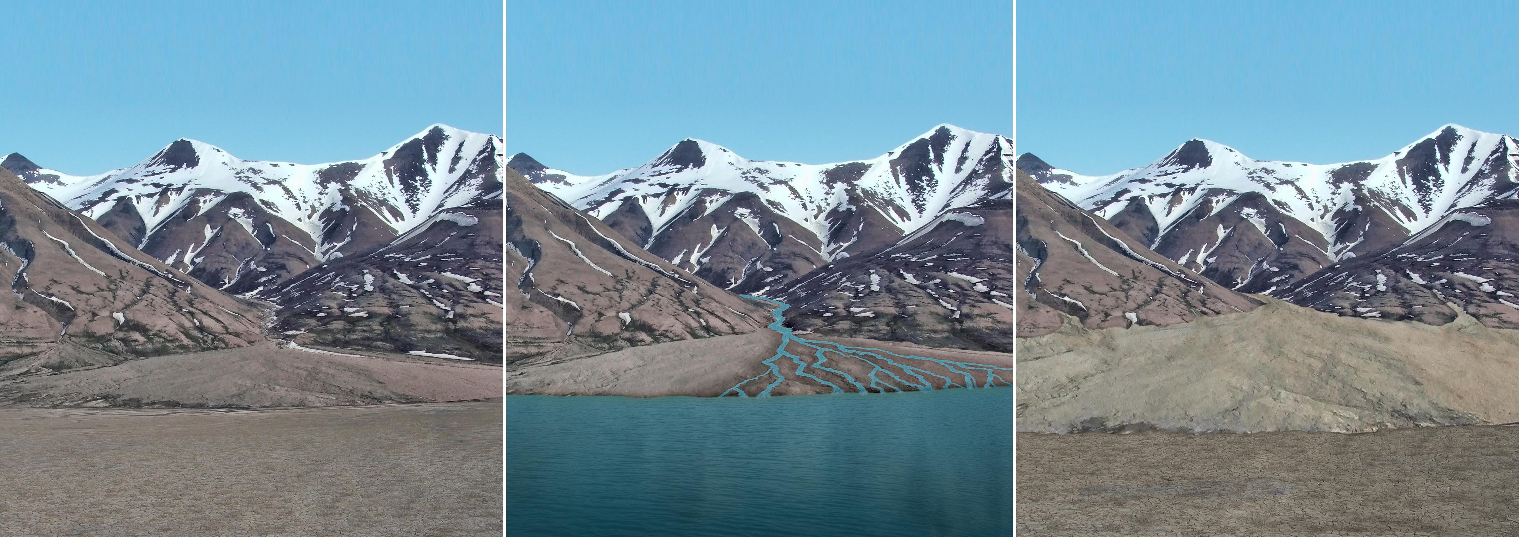 The mountain range serves as the rim of Gale Crater, the crater that surrounds Mount Sharp. In Mars' past, almost 4 billion years ago, water from snowmelt flowed down the mountain, creating an alluvial fan, delta and lake basin. The region oscillated between wet and dry periods, as illustrated here. A dry period is shown at left, during which rocks in the mountains weather away, creating sediment that is transported down the once-wet river system. The middle panel shows a wet period, where water is flowing. Sediments are transported, building up the fan, delta, and lake floor. In the subsequent dry period shown at right, the water is gone. The exposed fan and lake floor are now at higher elevations due to the transport of sediment during the previous wet period.