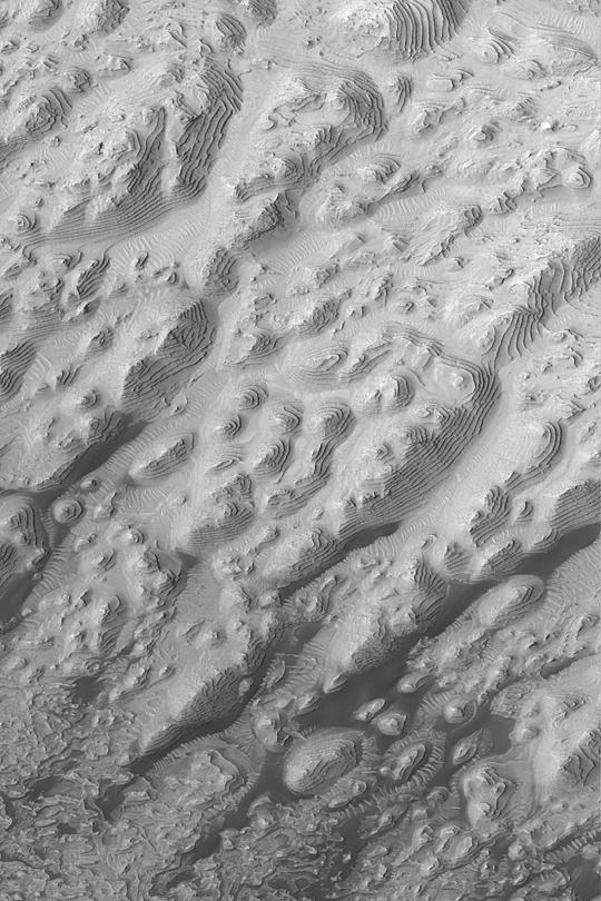 This Mars Global Surveyor (MGS) Mars Orbiter Camera (MOC) image acquired in March 2003 shows dozens of repeated layers of sedimentary rock in a western Arabia Terra crater at 8°N, 7°W. Wind has sculpted the layered forms into hills somewhat elongated toward the lower left (southwest). The dark patches at the bottom (south) end of the image are drifts of windblown sand. These sedimentary rocks might indicate that the crater was once the site of a lake--or they may result from deposition by wind in a completely dry, desert environment. Either way, these rocks have something important to say about the geologic history of Mars. The area shown is about 3 km (1.9 mi) wide. Sunlight illuminates the scene from the left.
