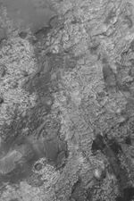This Mars Global Surveyor (MGS) Mars Orbiter Camera (MOC) image shows eroded layered rock outcrops in a crater north of Meridiani Planum near 2.7°N, 359.1°W. The dozens and dozens of sedimentary rock layers of repeated thickness and similar physical properties at this location suggest that they may have been deposited in a lacustrine (lake) setting. The crater in which these layers occur may once have been completely filled and buried, as is the case for many craters in the Sinus Meridiani region. This image covers an area about 3 km (1.9 mi) across; sunlight illuminates the scene from the left.
