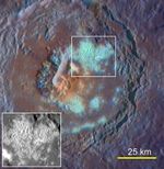 Tyagaraja is a large (97-km diameter) impact crater whose floor is partially covered by large numbers of coalesced hollows, giving the terrain an etched appearance. Here a high-resolution monochrome image has been combined with a lower-resolution enhanced-color image. The hollows appear in cyan, a result of their high reflectance and bluish color relative to other parts of the planet. The large pit in the center of the crater may be a volcanic vent, from which the orange material erupted.