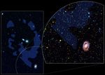 The faint blue overlay traces the outline of the Leo Ring, a huge cloud of hydrogen and helium that orbits around two massive galaxies in the constellation Leo (left panel). The cloud is thought likely to be a primordial object, an ancient remnant of material that has remained relatively unchanged since the very earliest days of the universe. Identified about 25 years ago by radio waves, the ring cannot be seen in visible light.