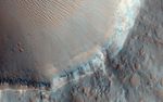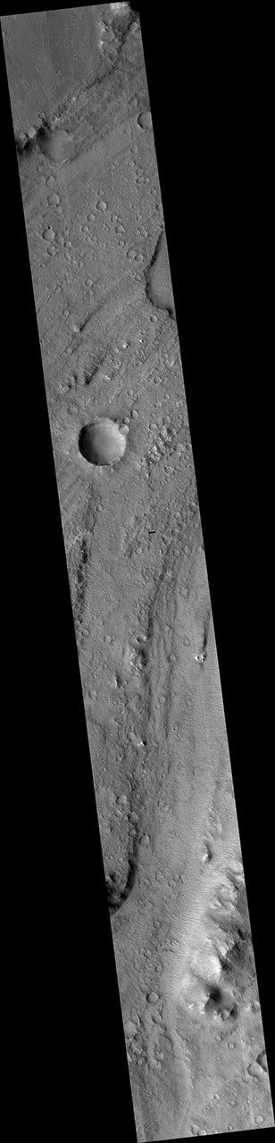 Although windblown sediments now cover the original flood-carved channel floor in a sea of dunes, a 1.5 kilometer diameter impact crater provides a window into the sediment on the channel floor. The crater exposes several layers along its upper walls including a distinct bouldery layer just below the mantle of windblown sediments. These boulders may have originated from the eruption site and were transported and emplaced on the channel floor by high energy floods. Alternatively, these bouldery layers may be lava that subsequently flowed across the flood scarred channel floors.