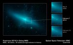 This image shows Spitzer's view of the supernova's host galaxy, M82 or the "Cigar galaxy," on three separate dates: May 9, 2005; February 7, 2014; and February 12, 2014. The observations from February 7 reveal the presence of a bright spot -- the supernova -- not present in the prior observations. By February 12, the supernova has started to dim somewhat from its peak brightness in the first week of February. The supernova, dubbed SN 2014J, was first spotted by human observers on January 21, 2014.