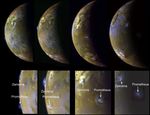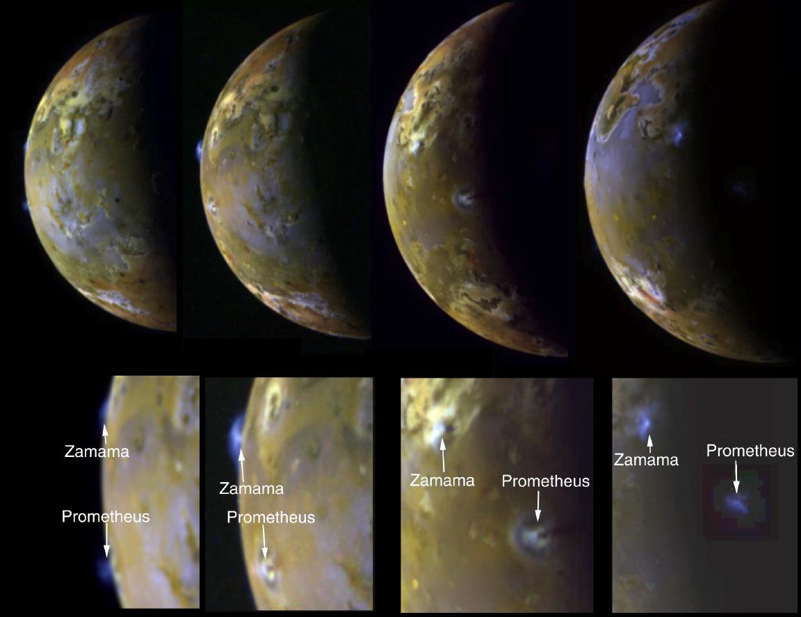 These four views of Jupiter's moon Io clearly show airborne plumes of gas and dust from two of Io's active volcanoes, Zamama and Prometheus. The bottom row consists of enlargements of the plume areas. The first view (left) depicts the tops of both plumes on Io's bright limb or edge. In the second image, an excellent view of Zamama on the bright limb reveals the umbrella-shaped structure. The third image also shows both plumes as bright spots against Io's illuminated crescent. In the fourth view (right) where the volcanic centers lie beyond the terminator (day-night boundary), the tall plumes are visible because they extend up into sunlight. The plumes have a height of about 100 kilometers (60 miles). Both plumes have been active throughout the Galileo tour of the Jovian system which began in 1996. Zamama, however, is considerably larger and brighter in these images from the spacecraft's eleventh orbit of Jupiter than when imaged previously. Prometheus was also active during 1979 flybys of NASA's Voyager spacecraft. There are two other much fainter plumes that can be detected on the bright limb of the third and fourth images. See if you can find them by changing the brightness levels of the images to enhance the dark regions.
