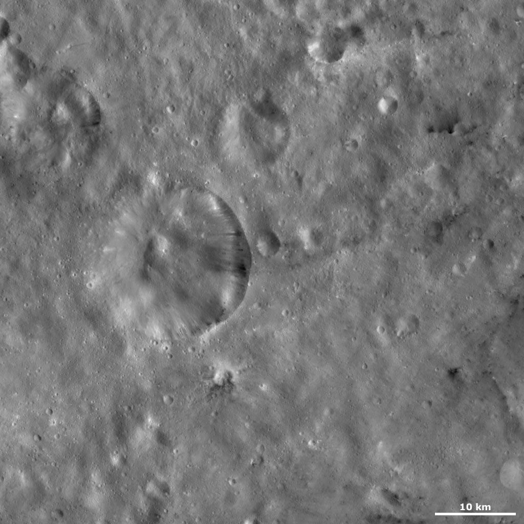This Dawn framing camera (FC) image of Vesta shows Serena crater, which is the large crater in the left middle of the image. The left side of the crater's rim is much more degraded than the right side, which is much fresher. Areas of dark and bright material crop out from slightly under the rim and slump towards the center of the crater. The longest slump streaks are nearly 5 kilometers (3 miles) long in the crater that is approximately 19 kilometer (12 miles) in diameter. There is a mound of material in the center of the crater and many small craters scattered over Serena crater. There are other smaller craters distributed throughout the image, which also have bright and dark material associated with them.