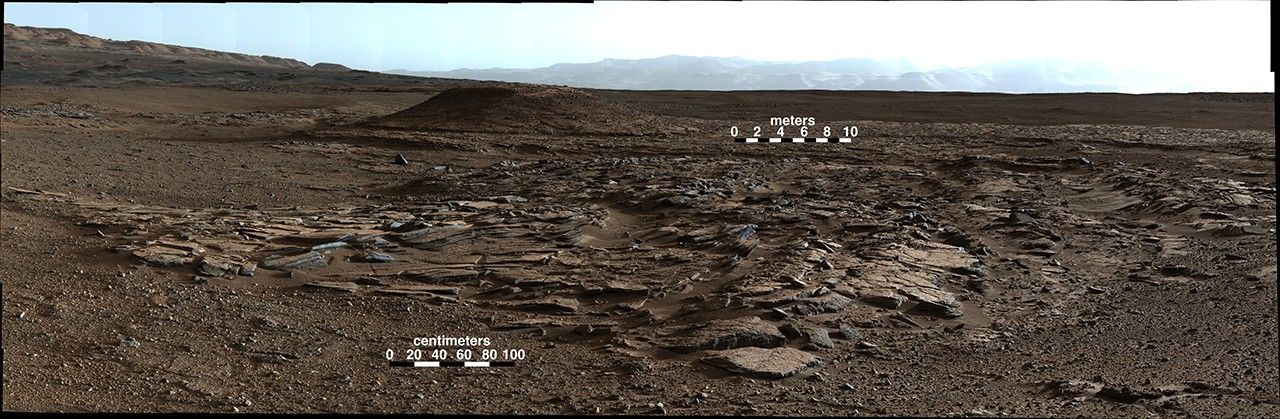 The Mastcam's left-eye camera recorded the component frames of this mosaic on April 4, 2014, during the 590th Martian day, or sol, of Curiosity's work on Mars. The color has been approximately white-balanced to resemble how the scene would appear under daytime lighting conditions on Earth. Figure 1 is a version with a superimposed scale bar of 100 centimeters (about 39 inches) in the foreground and a scale bar of 10 meters (about 33 feet) in the distance.