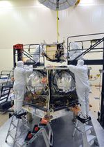 Workers place the special radiation vault for NASA's Juno spacecraft onto the propulsion module. Juno's radiation vault has titanium walls to protect the spacecraft's electronic brain and heart from Jupiter's harsh radiation environment. The whole vault, with more than 20 electronic assemblies inside, weighs about 200 kilograms (500 pounds). This image was taken on May 19, 2010, in the high-bay cleanroom at Lockheed Martin Space Systems in Denver, during Juno's assembly process.