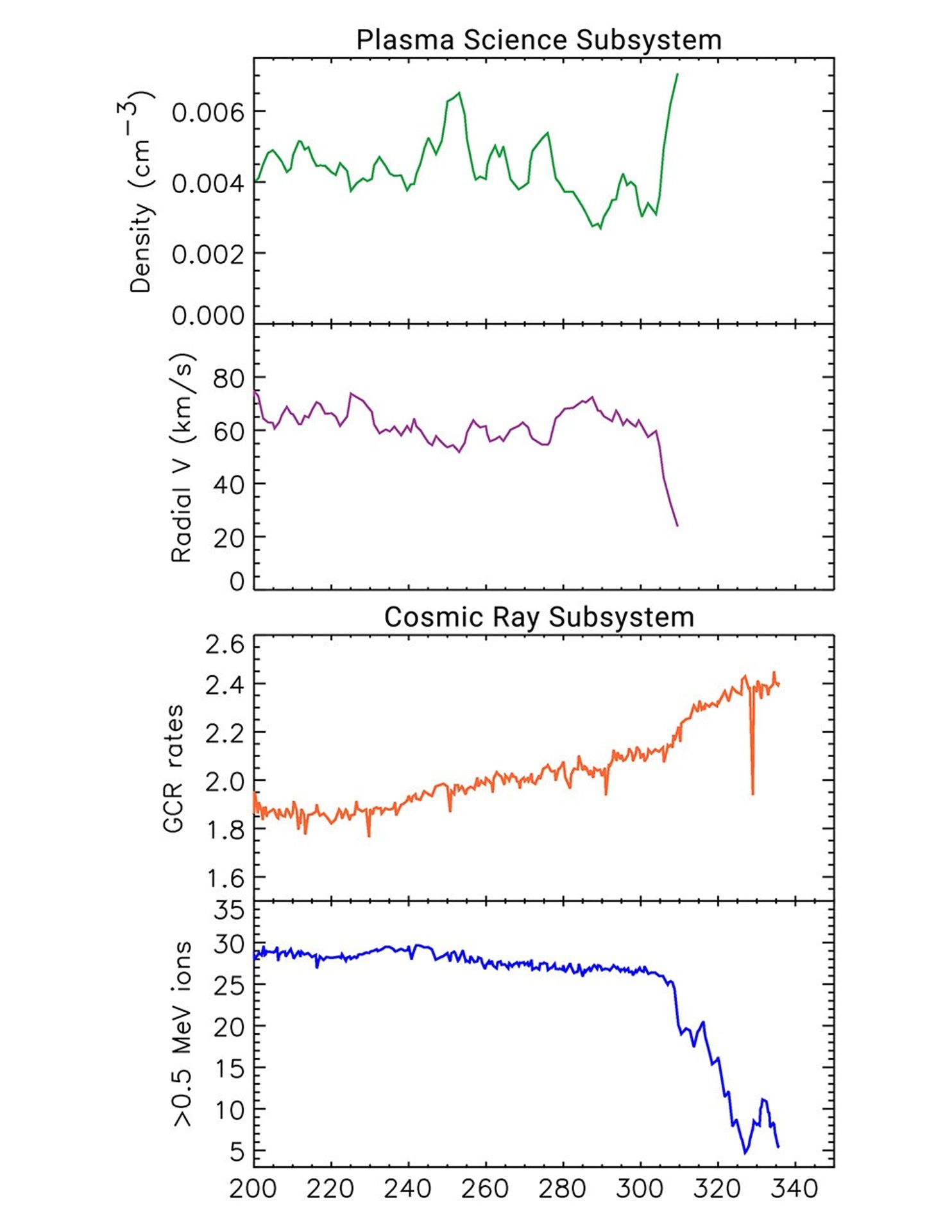 The bottom two plots come from the cosmic ray subsystem, which counts hits per second of higher-energy particles that originate from outside the solar bubble and lower-energy particles that originate from inside the solar bubble. The outsideparticles (also known as galactic cosmic rays or GCRs) increased and the inside particles (greater than 0.5 MeV) decreased at the same time the plasma science instrument detected its changes.